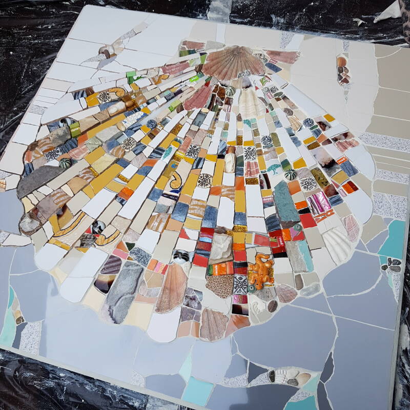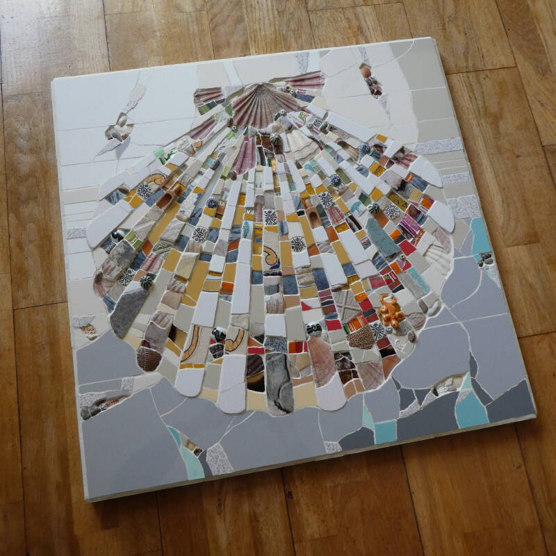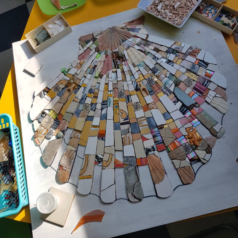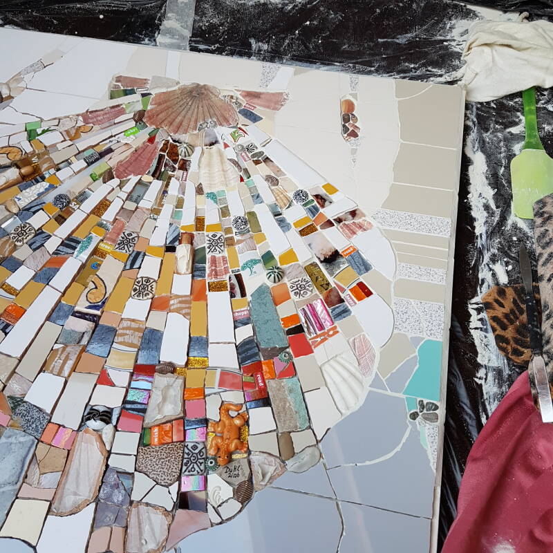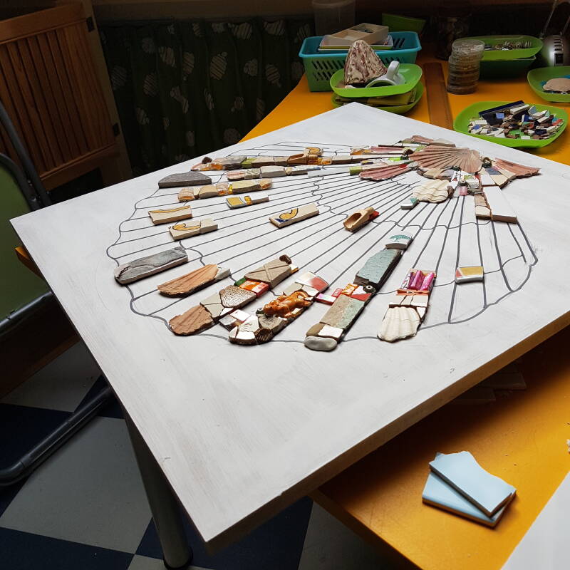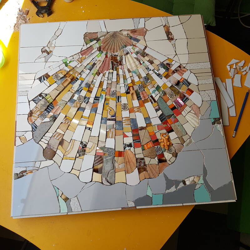 Hieronder foto's van de opzet en het verloop van het mozaïeken van "Coquille St Jacques"