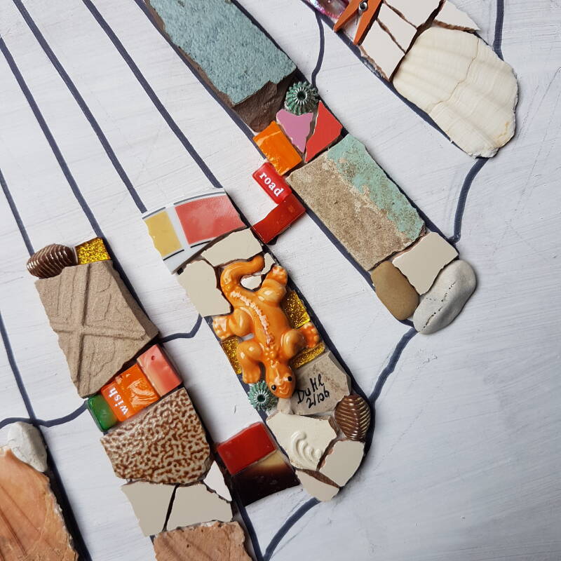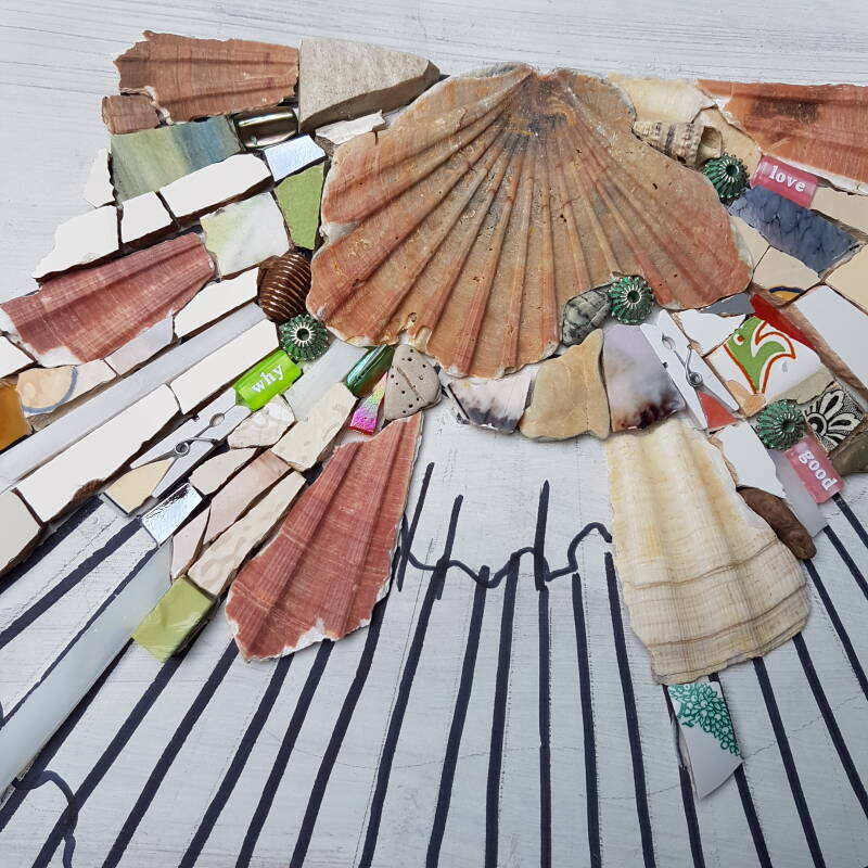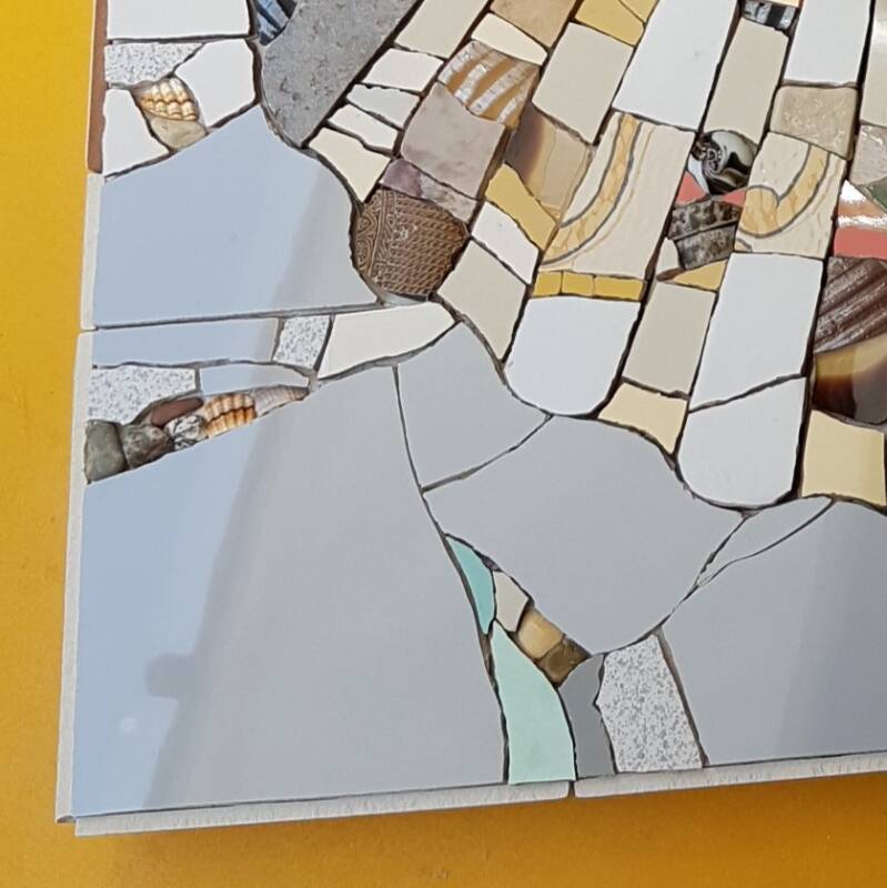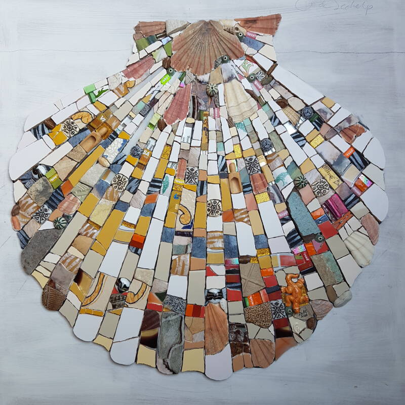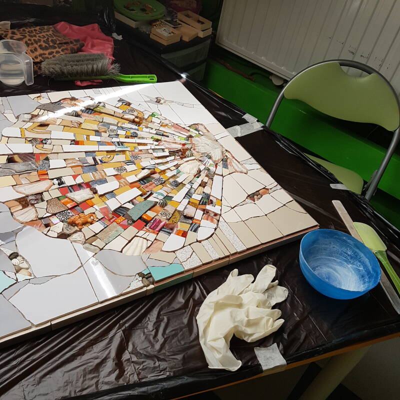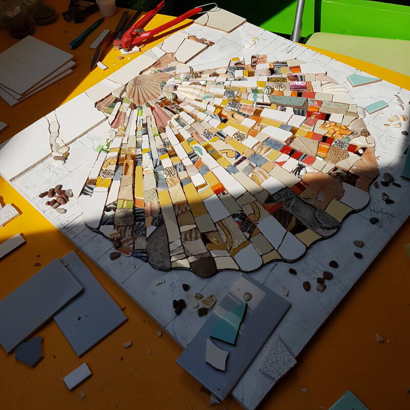 Hieronder foto's van de opzet en het verloop van het mozaïeken van "Coquille St Jacques"