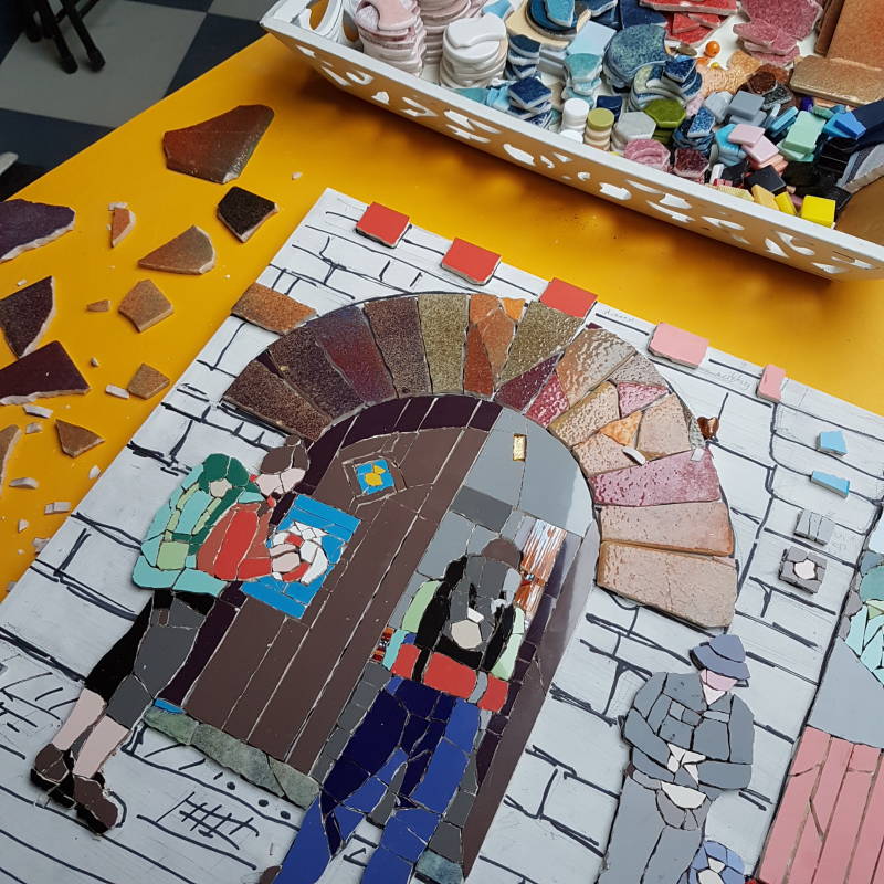 Hieronder foto's van de opzet en het verloop van het mozaïeken van "Serendipity"